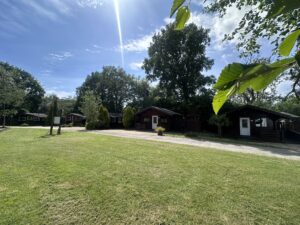 It’s has an open plan kitchen and living area with sofa bed, TV, dining table and chairs. Kitchen is equipped with everything you need for a self catering break. Bathroom has a lovely large shower. Patio doors from the lounge leads to your private gated decking back garden area. There is a table and chairs, a stone BBQ and a wonderful covered under shelter large square hot tub to enjoy come rain or shine. This cabin is under a great big Oak Tree sheltering the decked area for most of the day so is more suited for those who prefer a shadier spot.