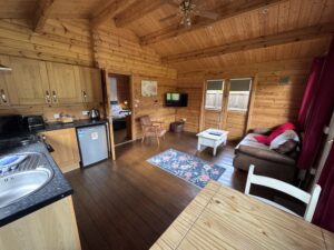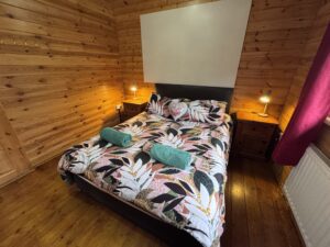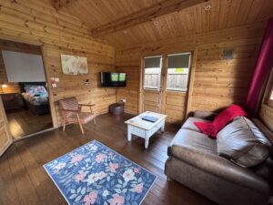 Spacious one bedroom cabin, sleeping up to three guests. With a lovely King size bed in the bedroom, and pull out sofa bed in the living room for a child.