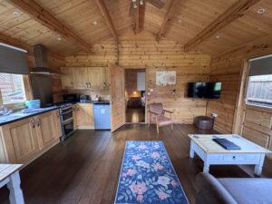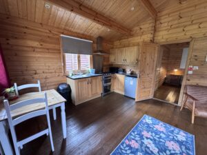 It’s has an open plan kitchen and living area with sofa bed, TV, dining table and chairs. Kitchen is equipped with everything you need for a self catering break. Bathroom has a lovely large shower. Patio doors from the lounge leads to your private gated decking back garden area. There is a table and chairs, a stone BBQ and a wonderful covered under shelter large square hot tub to enjoy come rain or shine.