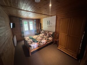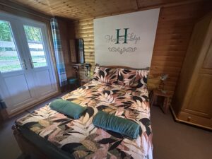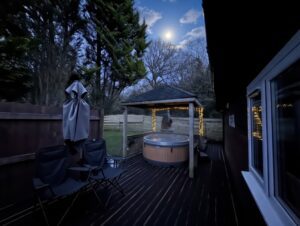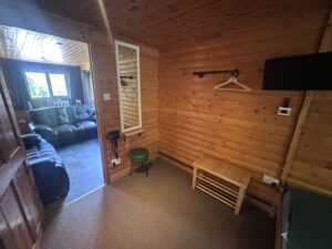 Pet friendly two bedroom cabin. It has a double bed bedroom and a twin beds bedroom. It has an open plan kitchen and living area with sofas, TV, dining table and chairs. Kitchen is equipped with everything you need for a self catering break. Bathroom has a shower. Patio doors from the master bedroom leads to your private gated back and side garden. There is table and chairs, a stone BBQ and a wonderful covered under shelter large round hot tub to enjoy come rain or shine.