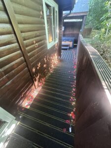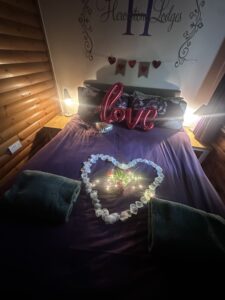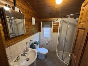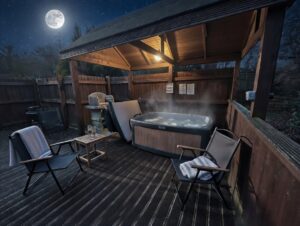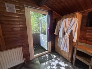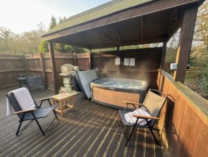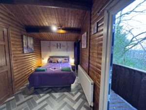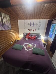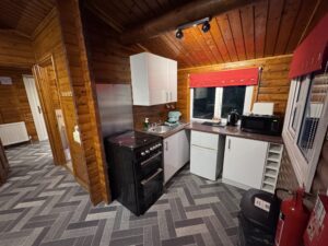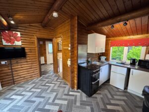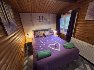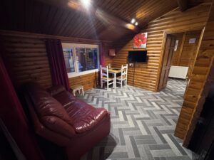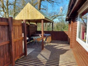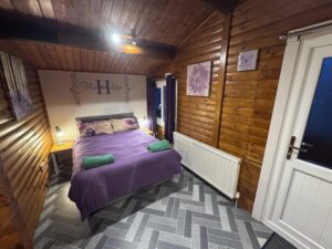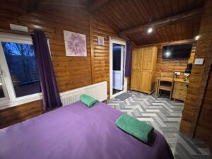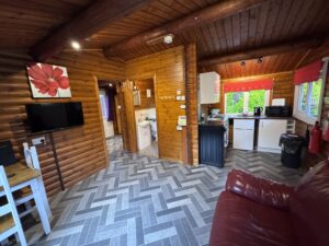 Cosy One bedroom cabin with a double size bed. It’s has an open plan kitchen and living area with sofa, TV, dining table and chairs. Kitchen is equipped with everything you need for a self catering break. Bathroom has shower. Door from the bedroom leads to your private gated back garden decked area. There is a table and chairs, a stone BBQ and a wonderful covered under shelter 2person hot tub to enjoy come rain or shine.
