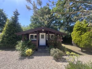 Pet Friendly one bedroom cabin with a double size bed. This is an open plan studio kitchen, living area and bedroom with sofa, TV, dining table and chairs. Private Bathroom with a shower. Kitchen is equipped with everything you need for a self catering break. Door from the bedroom leads to your private gated decked back garden area. Additionally, stairs that lead to a stone and grass fenced in garden. There is a table and chairs, a stone BBQ and a wonderful covered under shelter 2person hot tub to enjoy come rain or shine surrounded by woodlands.