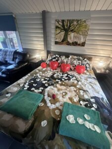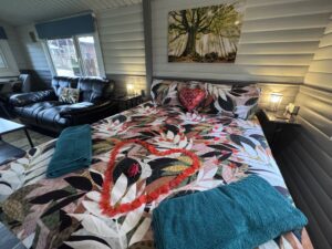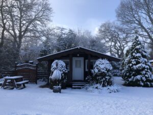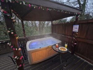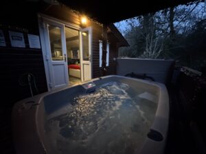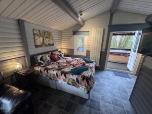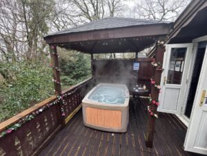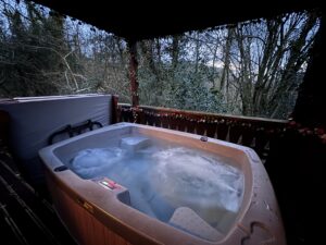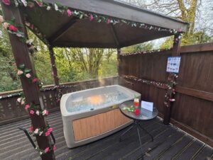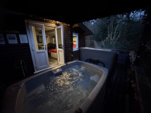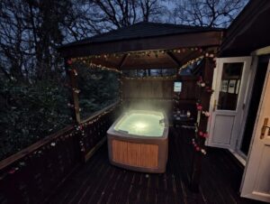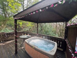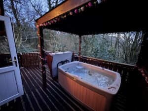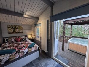 Cosy One bedroom cabin with a luxurious king size bed. It’s has an open plan kitchen and living area with sofa, TV, dining table and chairs. Kitchen is equipped with everything you need for a self catering break. Bathroom has shower. Door from the bedroom leads to your private gated decked back garden area. Additionally, stairs that lead to a stone and grass fenced in garden. There is a table and chairs, a stone BBQ and a wonderful covered under shelter 2person hot tub to enjoy come rain or shine surrounded by the woodland.