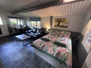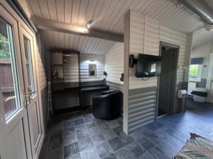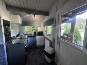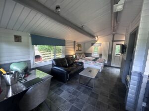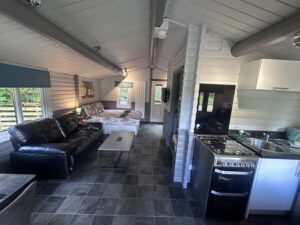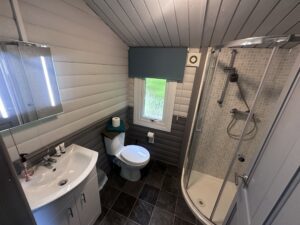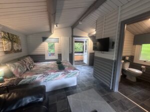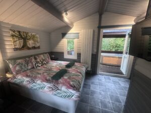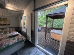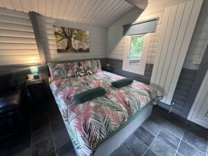 One bedroom cabin with a luxurious king size bed. This is an open plan studio kitchen, living area and bedroom with sofa, TV, dining table and chairs. Private Bathroom with a shower. Kitchen is equipped with everything you need for a self catering break. Door from the bedroom leads to your private gated decked back garden area. Additionally, stairs that lead to a stone and grass fenced in garden. There is a table and chairs, a stone BBQ and a wonderful covered under shelter 2person hot tub to enjoy come rain or shine surrounded by the woodland.